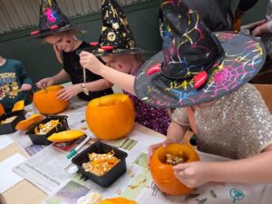 De Loods was prachtig versierd met ballonnen, slingers, heksen, spookjes en lichtjes Kinderen tussen 6 en 12 jaar konden, na opgave, gratis deelnemen aan deze activiteit . Een feest was het zeker, voor alle kinderen was er een pompoen om uit te hollen en hierna een gezicht in te maken zodat er een waxinelichtje in gezet kon worden.